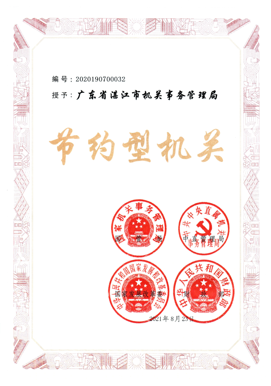 近日,湛江市机关事务管理局荣获全国第一批“节约型机关”称号,成为全国首批节约型机关建成单位。该荣誉由国管局、中直管理局、国家发展改革委、财政部在2021年8月23日授予,于2023年6月通过国管局回头看抽查,顺利通过验收后,正式获得。